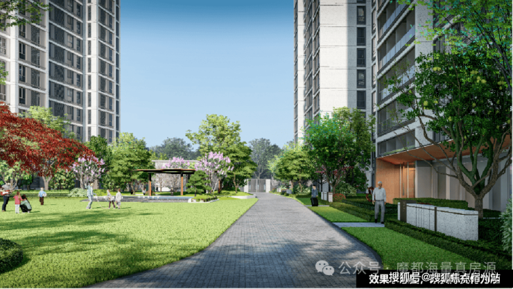接着,沿中心景观轴前行,一片翠绿盎然的阳光大草坪赫然呈现,它与周围特色景观组团相互映衬,仿佛置身于开阔的度假胜地。