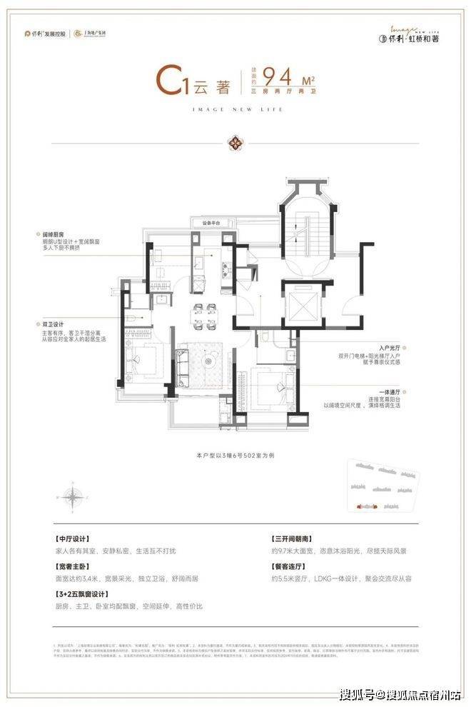 阳光梯厅入户、朝南三开间,铺就尊崇仪式感;U型厨房直连餐客连厅,款待客人相聚尽显从容;3+2五飘窗设计,会客休憩时有轻风相伴。