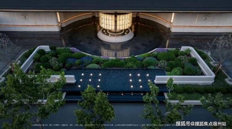 下沉式庭院,通过垂直景墙、悬浮观景台与叠水景观的立体交织,实现移步换景的视觉效果,也与会所空间形成无界交互。