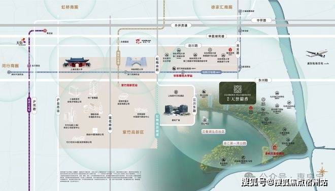 这里更大的特色,就是水多。黄浦江、大治河、金汇港的三水交汇,兰香湖所在的大零号湾,就在十字中心,湖面正好画龙点睛。水域资源与科创势能的叠加,让片区价值愈发稀缺。
