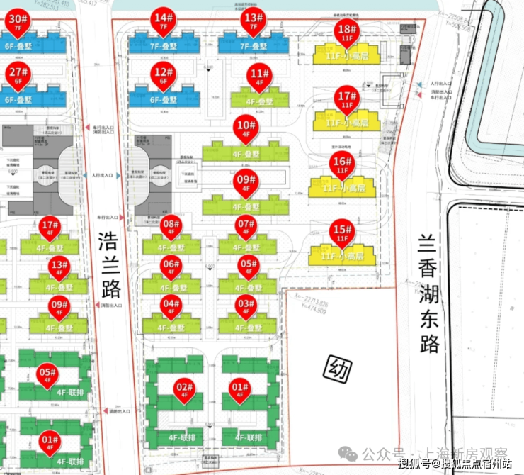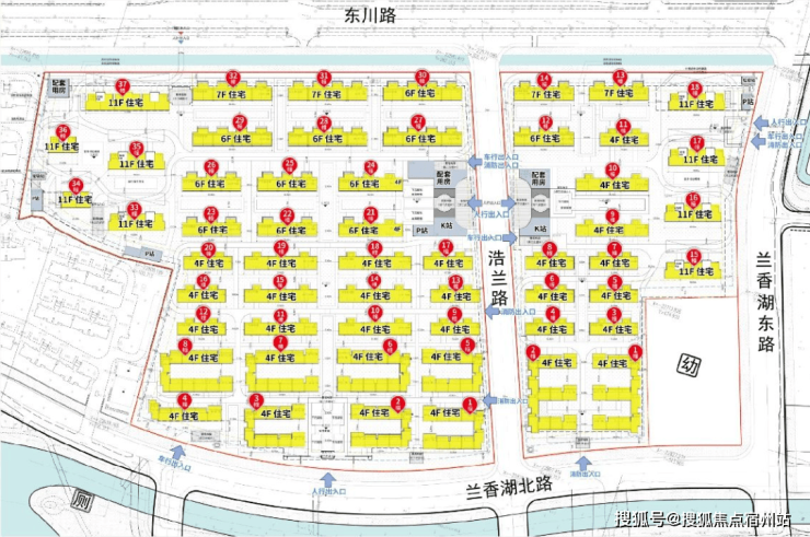 03-04地块:东至兰香湖东路,南至兰香湖北路,西至浩兰路,北至东川路,土地用途普通商品房,容积率1.01;由4幢11F高层住宅、14幢4-7F多层住宅以及若干社区配套用房组成,共计规划约342套可售住宅;