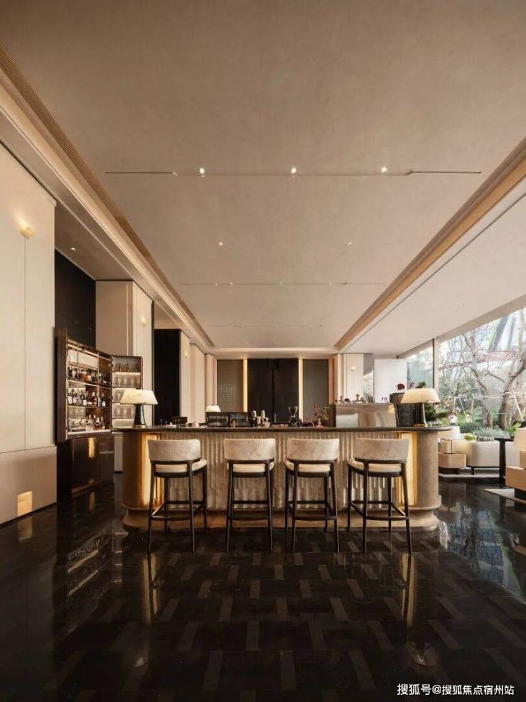 上海首个森林观瀑恒温无边泳池,以古驰黑奢石+非遗琉璃为背景,顶部极简设计,休憩区配置安缦御用品牌HARBOUR躺椅,无边泳池搭配脉冲按摩出水口,享受悠闲意境。