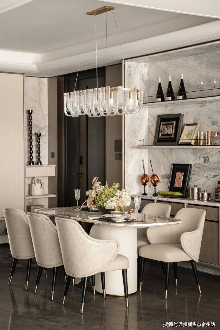 大量运用手工缝线皮革与大面积奢石的对碰、艺术肌理墙纸与天然雀眼木饰面及橡木地板的交融。