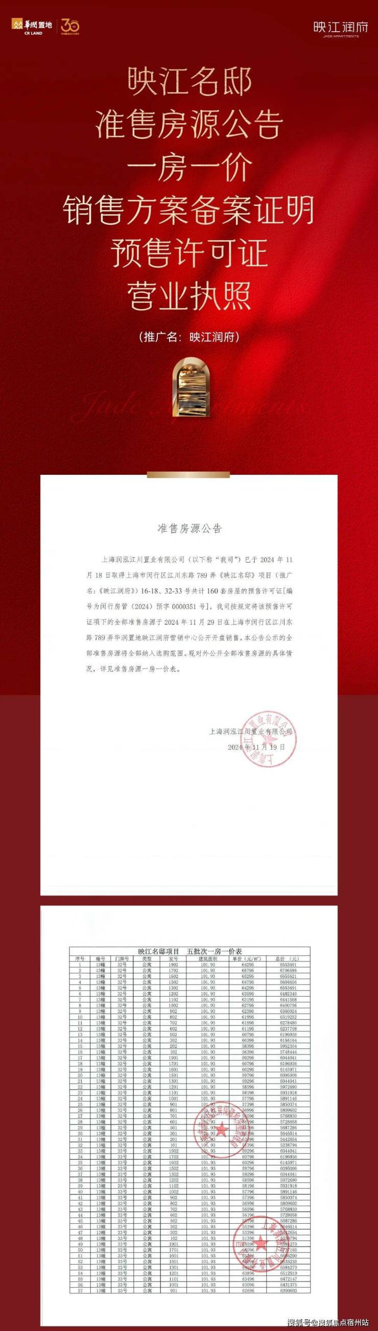 本资料为要约邀请,不作为要约或承诺,项目具体信息以政府最终审批文件为准;项目周围环境、交通及其他公共设施的效果示意以实际落成或政府部门标准文件为准。有关学区划分根据政府部门当年的划分为准,不作为开发商的任何承诺。相关宣传内容不排除因政府规划、规定及分期规划、未能控制等原因发生变化,在不违反法律法规、合同约定前提下,本公司有权对该宣传资料细节进行调整或更新。预售证号:闵行房管(2024)预字0000120号、闵行房管(2024)预字0000164号、闵行房管(2024)预字0000232号、闵行房管(2024)预字0000269号、闵行房管(2024)预字0000351号。制作日期: 2024年11月19日。开发商:上海润泓江川置业有限公司;备案名: 映江名邸 ;营销推广名:映江润府