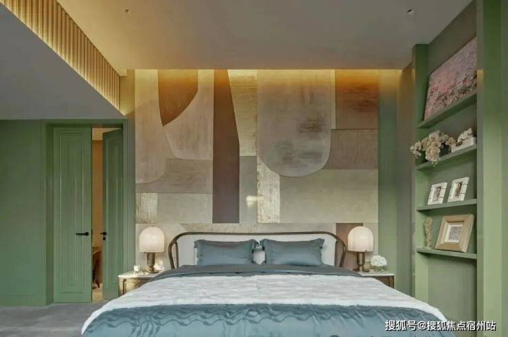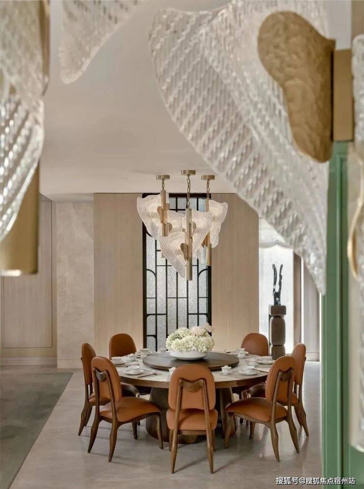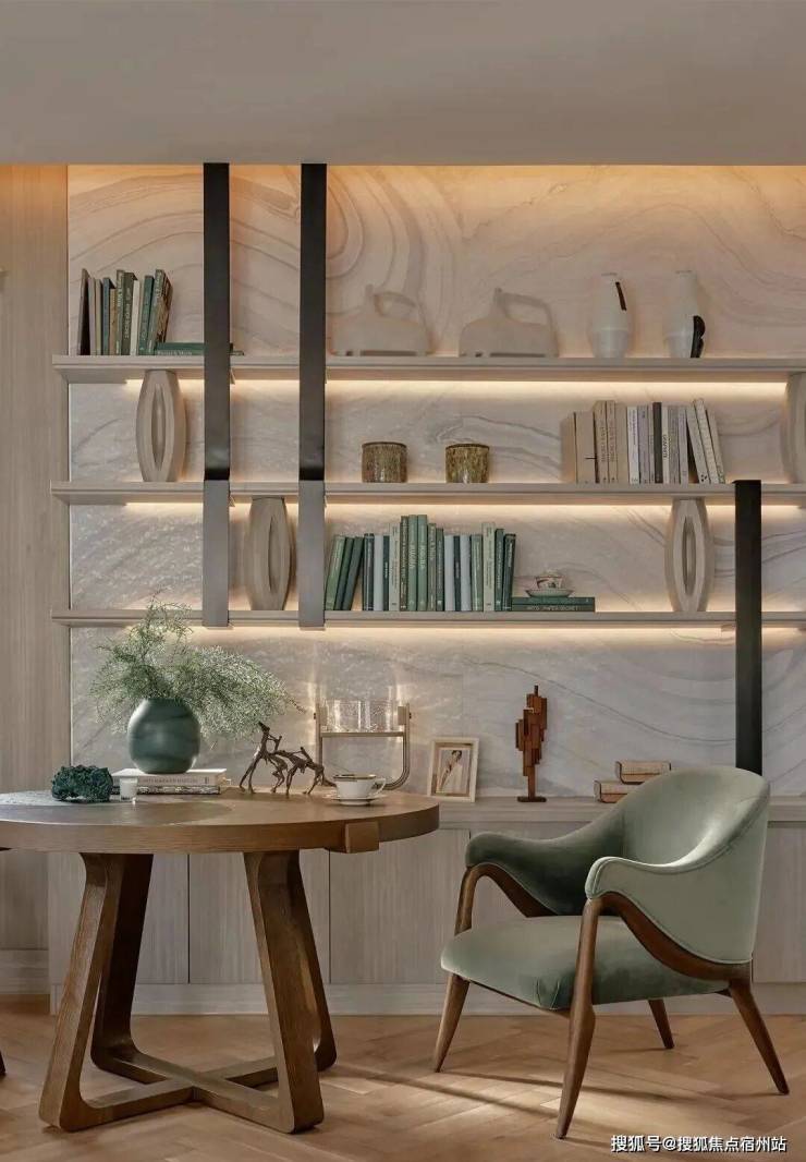顶层下午茶区以淡绿为底,壁炉暖光漫过手绘地毯的肌理,将社交场域沉淀为冥想容器;主人房墙面缟玛瑙(Onyx)的天然流痕,也与一层屏风暗纹形成时空对位,光影在矿物晶体中生长出私密的诗。