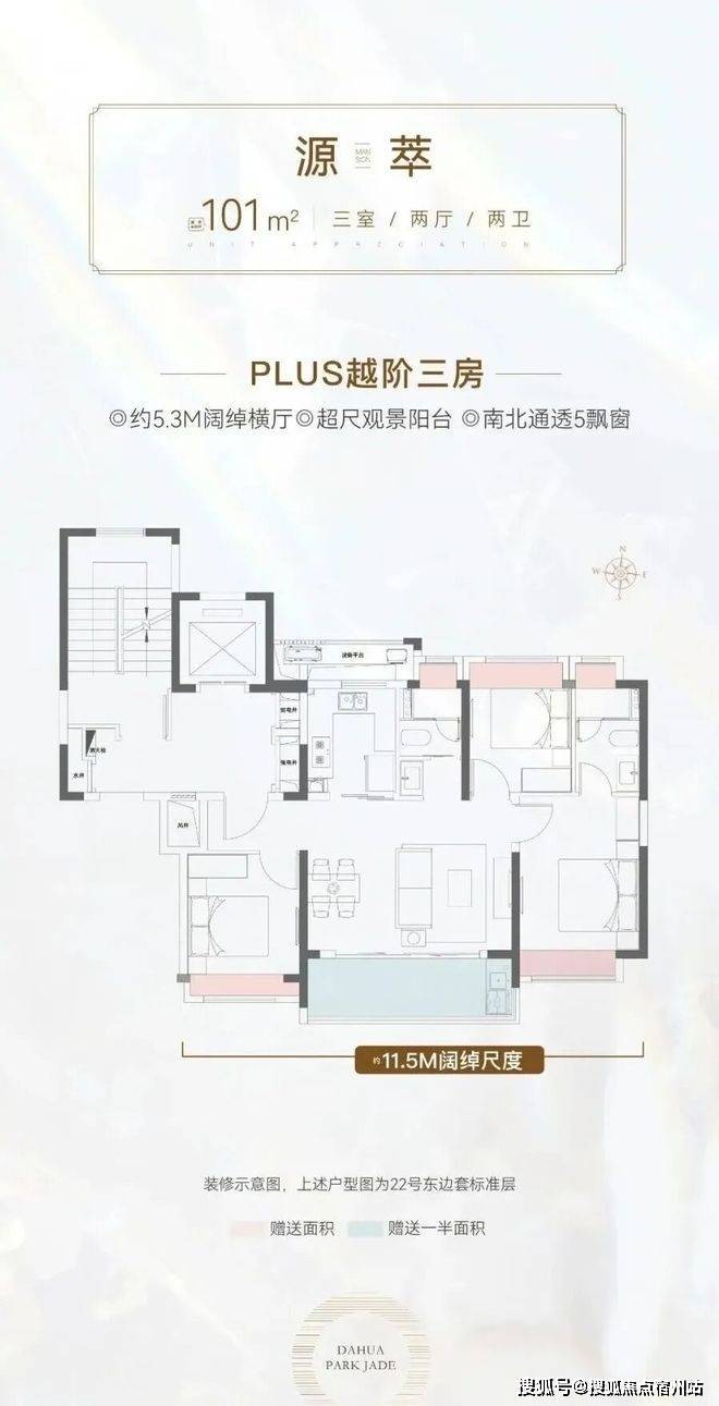 建面约101㎡3房2卫户型,非常标准的飞机户型。