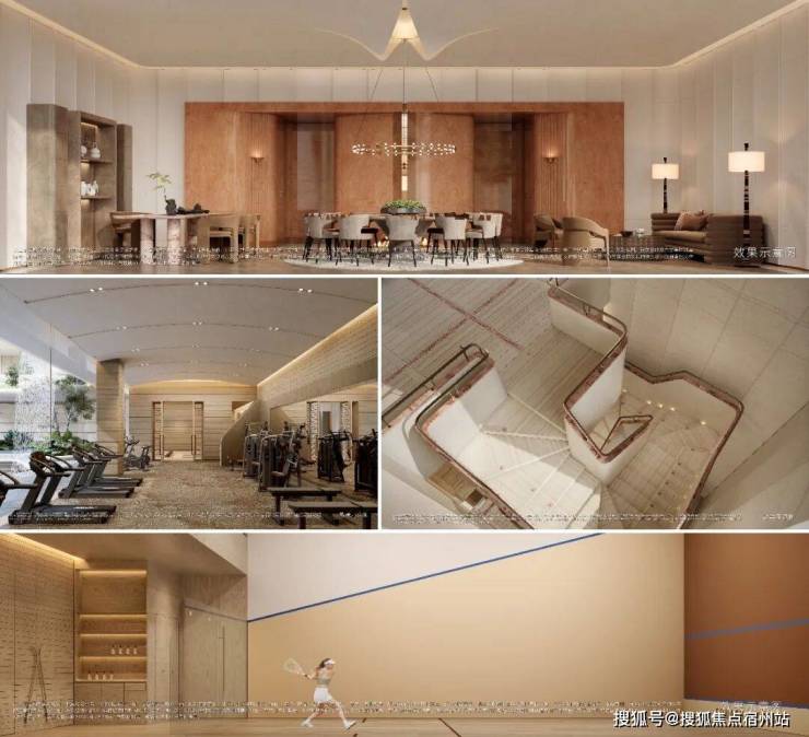 艺术旋转楼梯、地下光厅、区域首创国标壁球馆、飞瀑园景健身房、嵌入式景观书吧 等,深度还原度假酒店质感