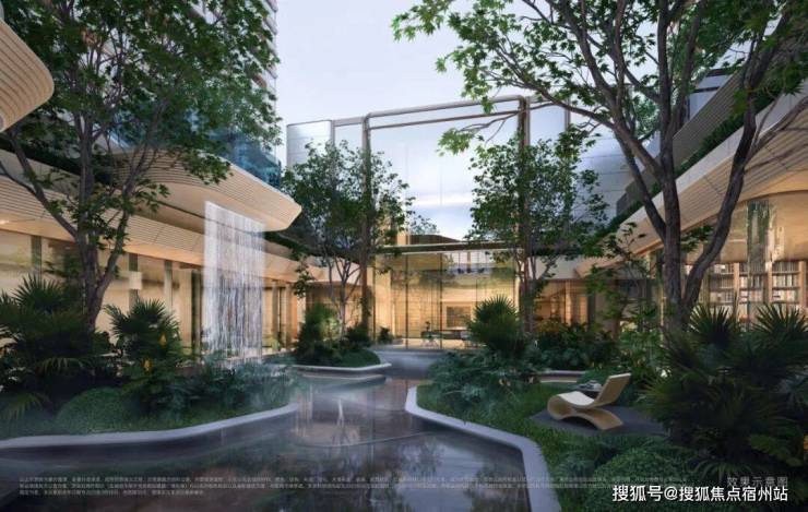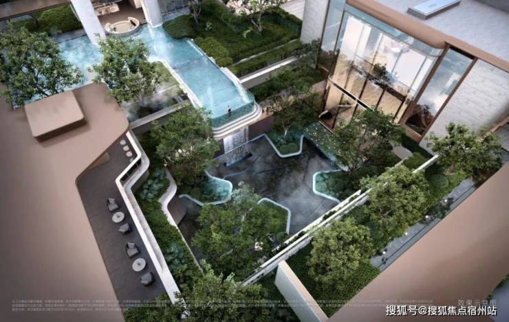 • 下沉峡谷 :约420 ㎡丰富层次立体下沉庭院,区域首现悬浮水池,搭配4.3 米飞瀑,塑造沉浸式度假感受