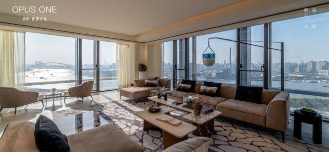 这客厅既是270°全景舱厅,无论全家在餐桌前欢聚一堂,还是孩子们在客厅嬉戏,一抬头便是以江景和城市为主题的巨幅油画。