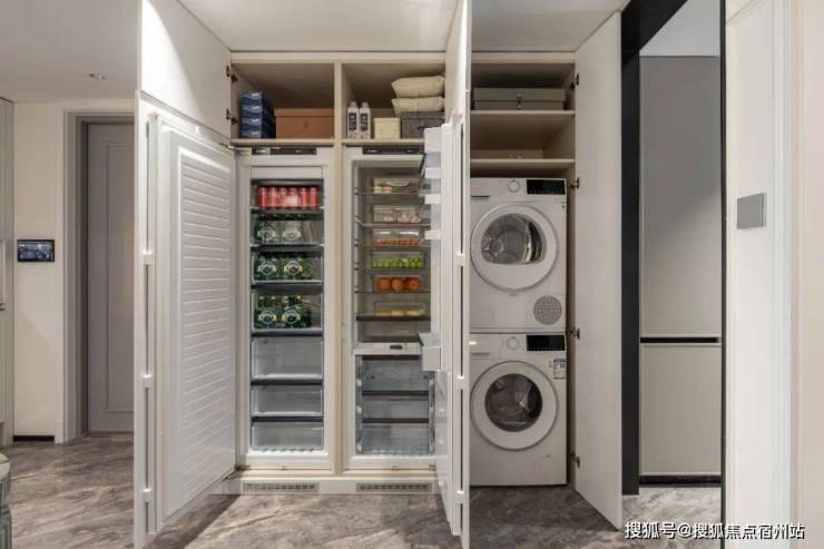 项目里的精奢生活系统,更是让人眼前一亮。风格系统采用老钱风审美,以优雅低调的高级灰为主色调,营造出低饱和、极简的米白灰等颜色的室内空间。颇具设计感的入户玄关宝格丽白石材台面及背景板,餐客厅大面积的墙布、木饰面和大理石材的组合,以及金属踢脚线的打造,彰显出雅奢格调。