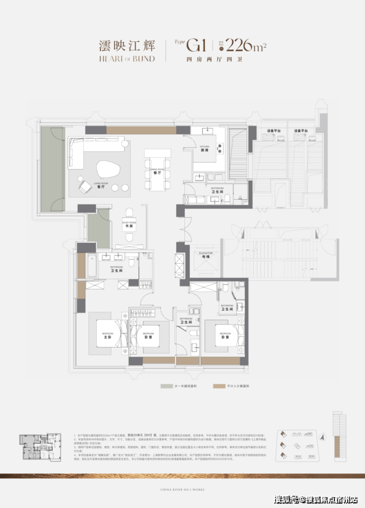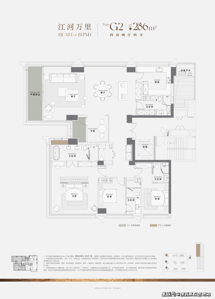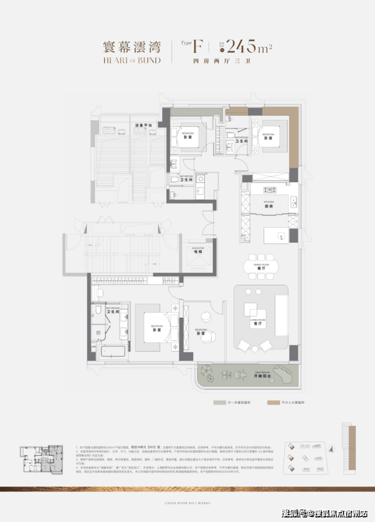 户型规划上,澐启滨江精准聚焦城市顶流改善需求,打造纯粹大平层与江景洋房户型矩阵,主力在售高层建面约220㎡四房两厅三卫、265㎡五房两厅三卫、315㎡五房两厅四卫,洋房建面约360㎡六房两厅四卫、430㎡七房两厅五卫,均为南北通透、全明格局,适配顶流家庭全周期居住需求,得房率在同面积段产品中表现突出(高层得房率79%,洋房得房率86%),兼顾实用性与奢享感,同时融入人性化设计,打造舒适便捷的居住空间,每一套户型都能欣赏到一线江景,实现“推窗见江、揽尽繁华”的居住体验。