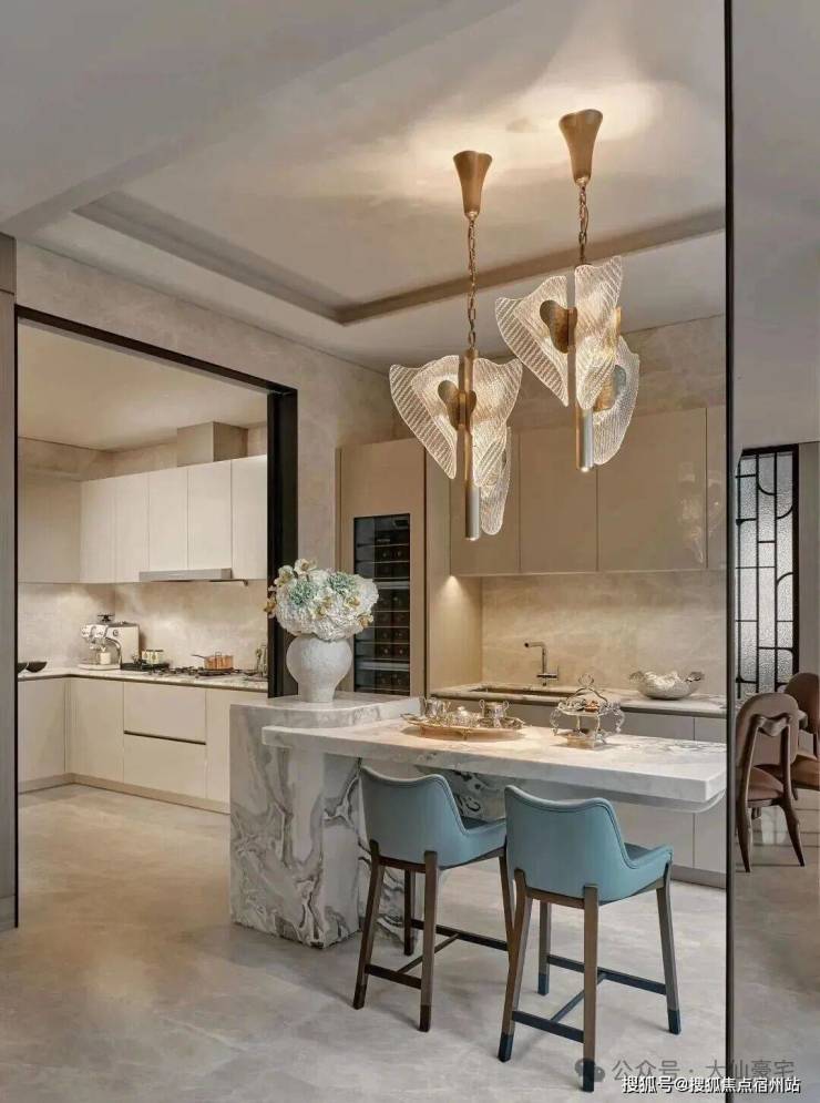 主厅核心区悬浮式定制柜体,银箔与丝绸在几何切割中构建中式基因,毕加索石材的天然裂变肌理成为天然艺术装置。瀑布吊灯以流体力学演绎东方留白,让光影在岩板表面生长出动态水墨意境。