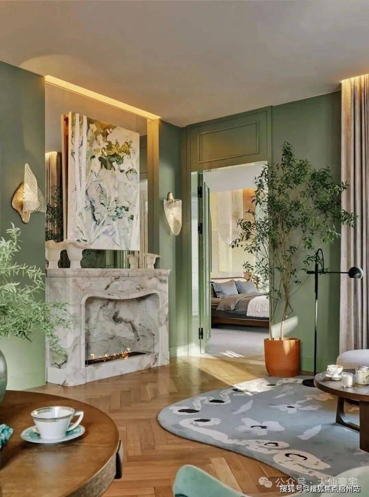顶层下午茶区以淡绿为底,壁炉暖光漫过手绘地毯的肌理,将社交场域沉淀为冥想容器;主人房墙面缟玛瑙(Onyx)的天然流痕,也与一层屏风暗纹形成时空对位,光影在矿物晶体中生长出私密的诗。