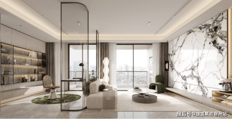 客厅岩板背景墙的应用,典雅气派、肌理丰富,营而着简约不失奢华的家居氛围。