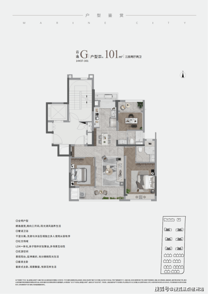 LDK客餐厨一体、在百平户型段引入南向双联阳台与独立功能阳台,主卧配置270°的L型环景飘窗,年轻小夫妻居住首选!