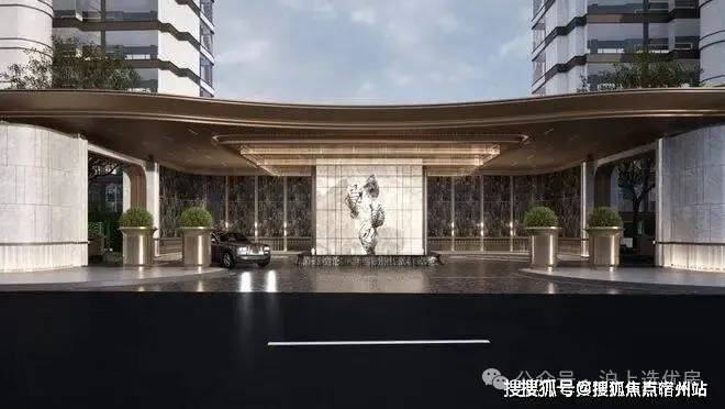 主出入口整体长约30米,进深约23.5米,将 顶部廊架扩展到到中岛以外,彰显大气的特色。挑高金属雨棚采用极细边,中间凿壁采用透光奢石,搭配极具现代主义的雕塑彰显小区档次,背景墙面采用维多利亚黑大理石,奢华且低调。