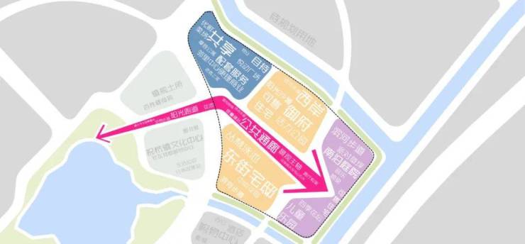 一条连续的公共通廊由海天湖公园引入社区,贯穿三大功能结构区。