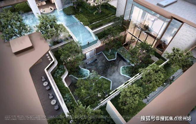 飞瀑之上,是一座无边悬浮戏水池,可直接俯瞰下沉式景观庭院,身处其中仿佛与自然融为一体。