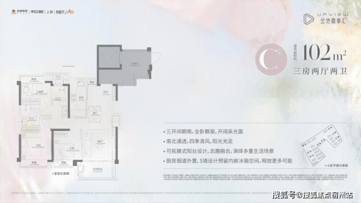 以及我们的 建面约102㎡(C户型)三房两厅两卫,不仅保留了其小户型所有的优势,更增强了空间感和舒适度!
