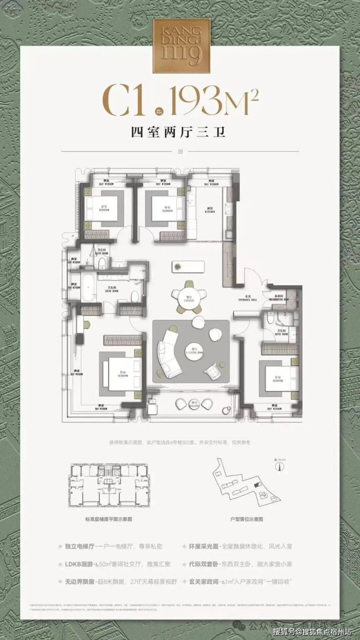 入户玄关约1㎡的家政间、约50㎡客餐厨阳台空间、超8米的飘窗······
