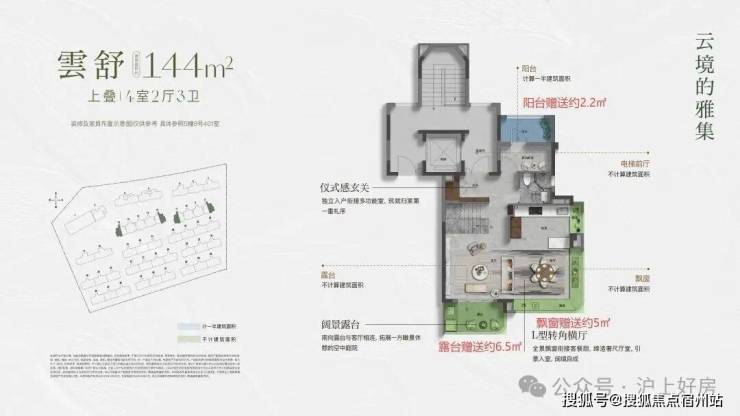 建面约144㎡的上叠产品,通过巧妙的 挑 空 、 总计 约 15㎡露台 及 灵动空间 设计,让户型的 实际可使用面积高达约180 ㎡,实得率约125%。