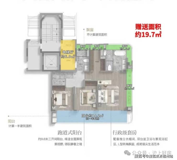 在细节打磨上,此户型亦不遗余力。 全屋飘窗全赠送约9.8㎡,配合约7.2㎡的大阳台(计一半建筑面积) 不仅增加了实际使用面积,更在视觉上提升了空间的通透感。