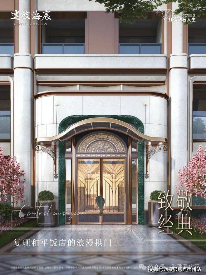 萃取东方色谱精粹,建发·海宸甄选丝箔流金、东方雅铜,青釉奢蓝,以当代笔触晕染立面,令传统色彩在空间生长为永恒的诗意,「入户门头」形取和平饭店经典拱门,配以碧绿色天然石材门套、彩玻花窗,重现百年外滩门廊的尊崇仪式。