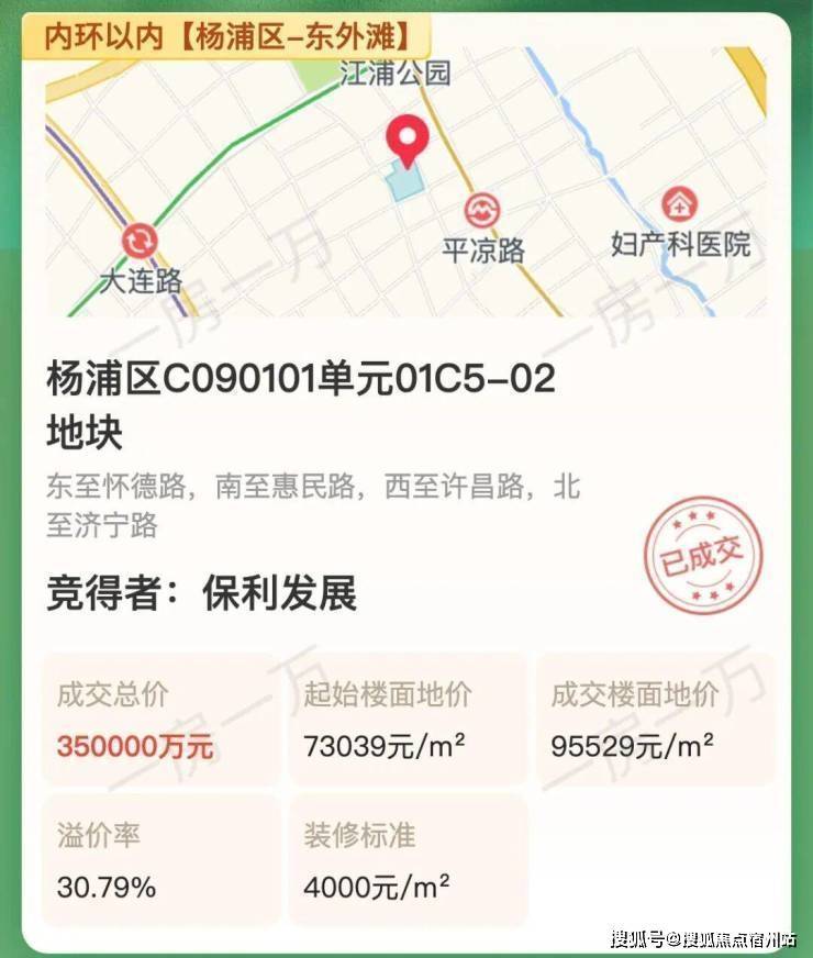 2025年6月上海5批次土拍中,6大国央企经过95轮激烈竞价,最终由保利发展以总价35亿元、楼板价95530元/㎡摘得杨浦东外滩64街坊地块(01C5-02地块)。