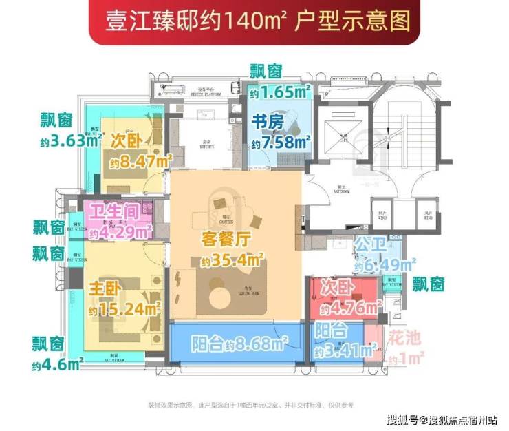 建面约140㎡户型则通过6个飘窗 (含2个270°转角飘窗)、 2个南向阳台 (赠送一半面积)及 独享约6.8㎡电梯厅 ,赠送面积高达约27.2㎡。