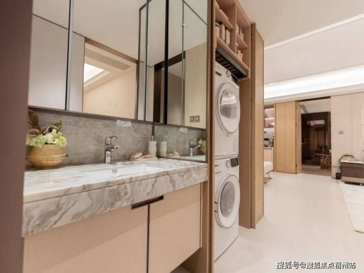 它整合了洗烘套件、分类收纳,将洗衣、烘干、收纳整理集中于一体。另外据说后期开发商可提供阳台改造隐形晾衣架服务,供业主自主选择烘干或晾晒。