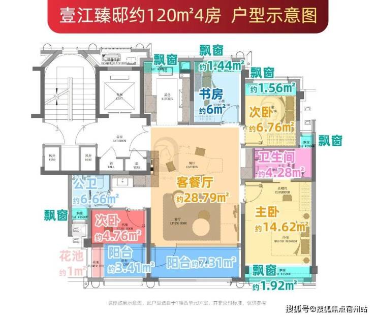 建面约120㎡户型通过6个飘窗、2个南向阳台 (赠送一半面积)及 独享约5㎡电梯厅 ,整体赠送面积约18.5㎡。