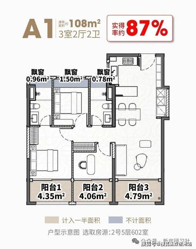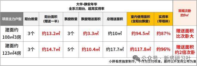 建面约108㎡3房,三阳台面积达约13㎡(赠送一半),飘窗赠送约3.3㎡,室内使用面积达约94.5㎡,实得率高达约87%,总赠送面积比常规次卧都大。