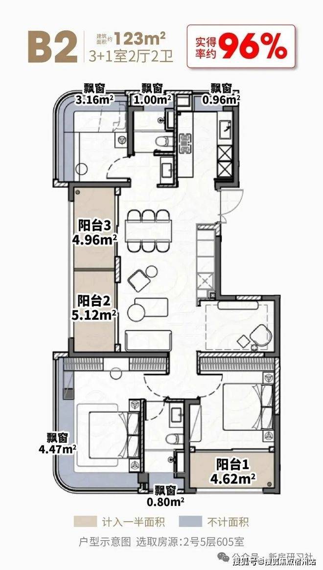 建面约123㎡4房,三阳台面积达约14.7㎡(赠送一半),5飘窗赠送高达约10.4㎡,室内使用面积约117.8㎡,实得率高达约96%,总赠送面积相当于两个次卧。