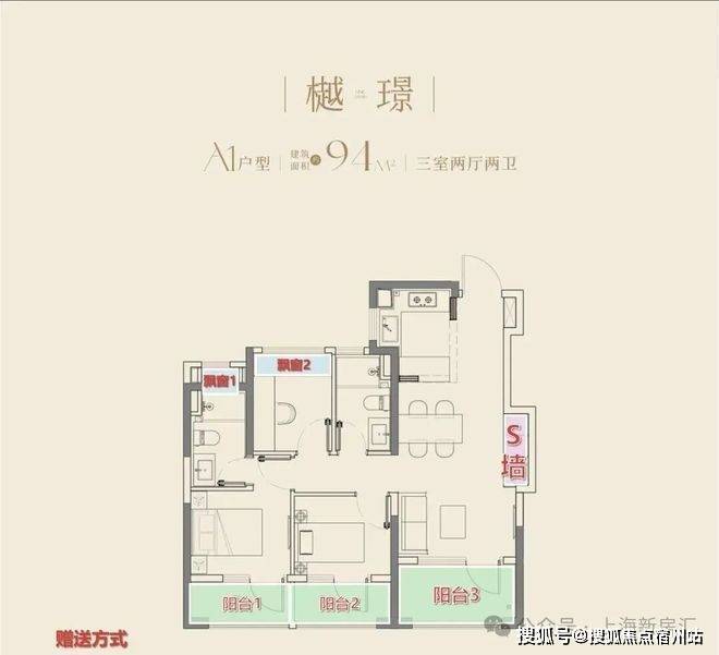 约94㎡起步户型:设计了市场上不多见的南向三阳台,凭借充足(约9%)的赠送面积,实现空间利用率最大化。
