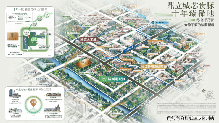 松江新城历经 20 余年发展,城市界面成熟,政务、商业、教育、医疗、生态配套全部实景呈现,无需等待规划落地,是松江公认的高端宜居核心区。项目北接松江大学城(汇聚上外、东华等 7 所高校),人文底蕴浓厚,承接科创产业高净值人口外溢;南临 G60 科创走廊,集聚数千家科创企业,产业赋能强劲;西靠油墩河谷生态规划,生态资源优越,兼具成熟居住氛围、科创产业红利与优质教育资源,是松江改善置业的核心优选。