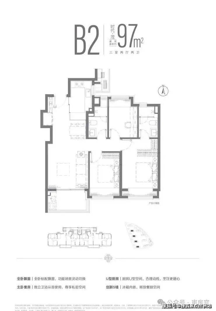 建面约 99㎡三房两厅两卫 :经典改善户型,南北通透全明设计,空间尺度从容不迫。客厅开间阔绰,外接观景阳台,尽揽社区园林美景;主卧套房设计,配备独立卫浴与观景飘窗,保障主人隐私与专属仪式感;双卫配置,早高峰无需争抢,提升生活效率;动静分区明确,休闲起居互不干扰,适配三口之家温馨日常。