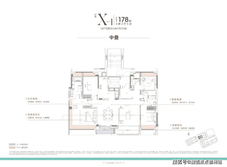 中平户型以四开间朝南的IMAX级采光面,打造出堪比市区豪宅的尺度感。4房4飘窗2阳台的设计,配合双套房布局,一共有三个套房,让每个家庭成员都享有独立私密空间。