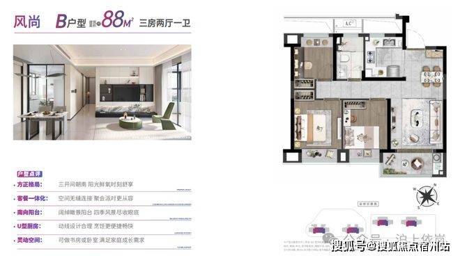 入门级的建面约88㎡三房两厅一卫,南向三开间,✅✅深嘉上府售楼处电话:400 - 882 - 4258✅✅两间卧室朝南,通风采光俱佳,每天早上都能被阳光叫醒!