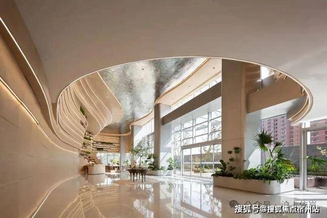 8米挑空大堂仿佛打翻了艺术调色盘✅✅深嘉上府售楼处电话:400 - 882 - 4258✅✅,银色水波纹天花板搭配落地绿植,随手一拍都是大片既视感!
