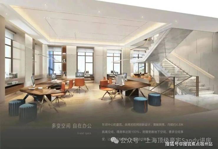 二)创新结构:创新采用大跨度无中柱框架结构设计,铸就超高得房率。一般上海甲级商办楼层高仅为2.5米~2.7米,而东郊中心层高约4.5米,使空间具备更多可能性。