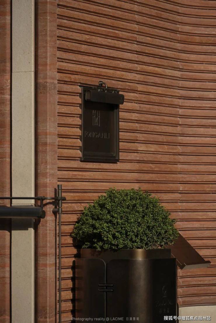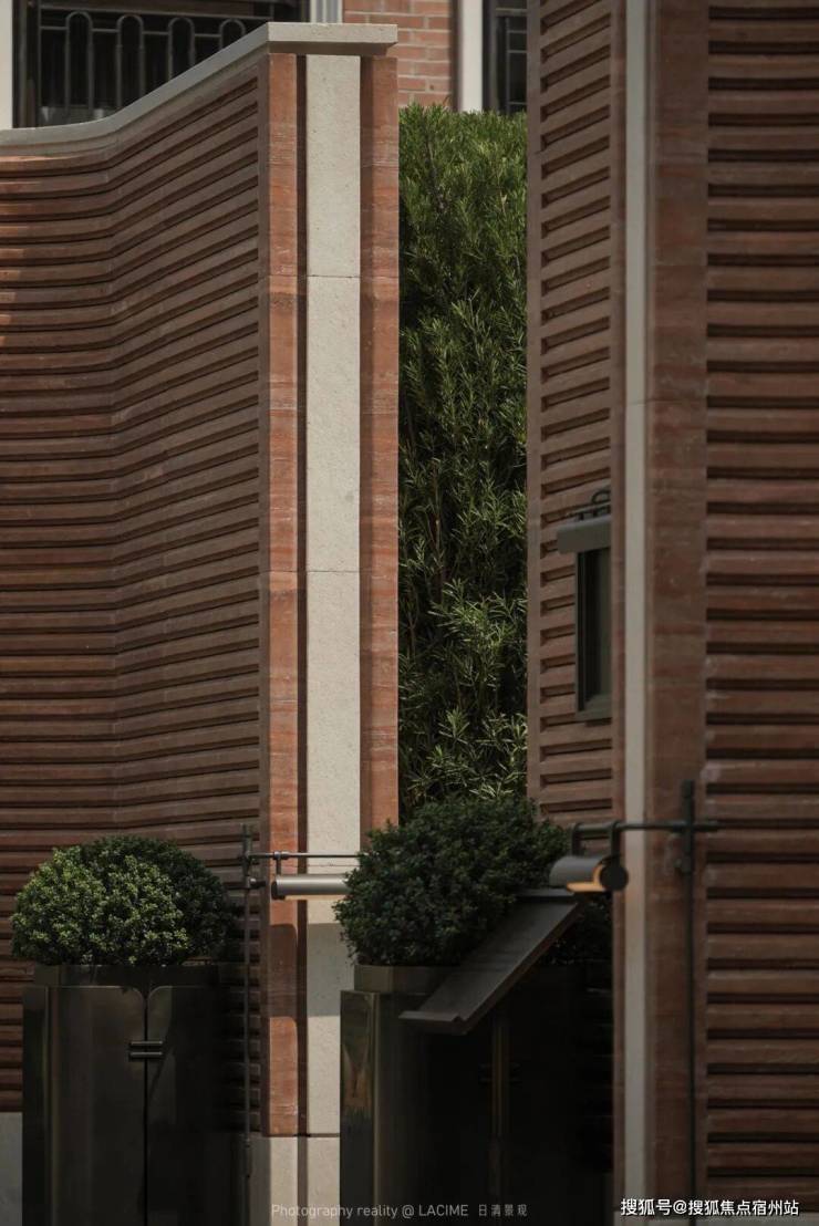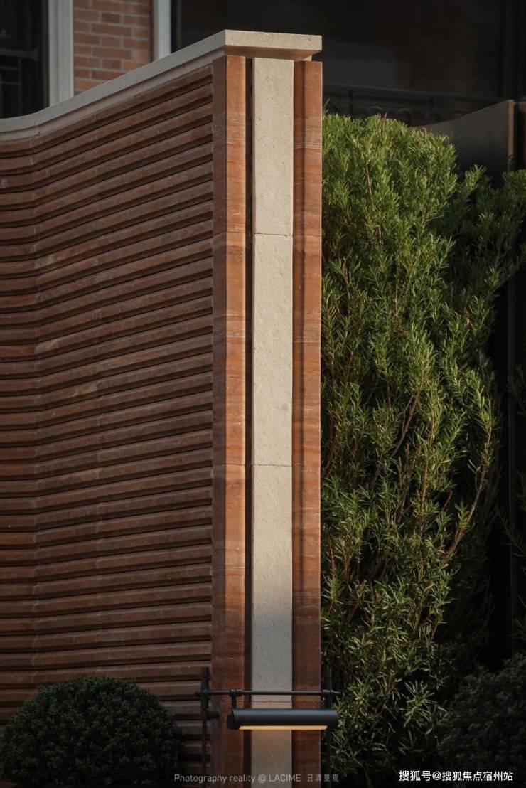 挑选与建筑红砖同色的红洞石做拉槽处理,