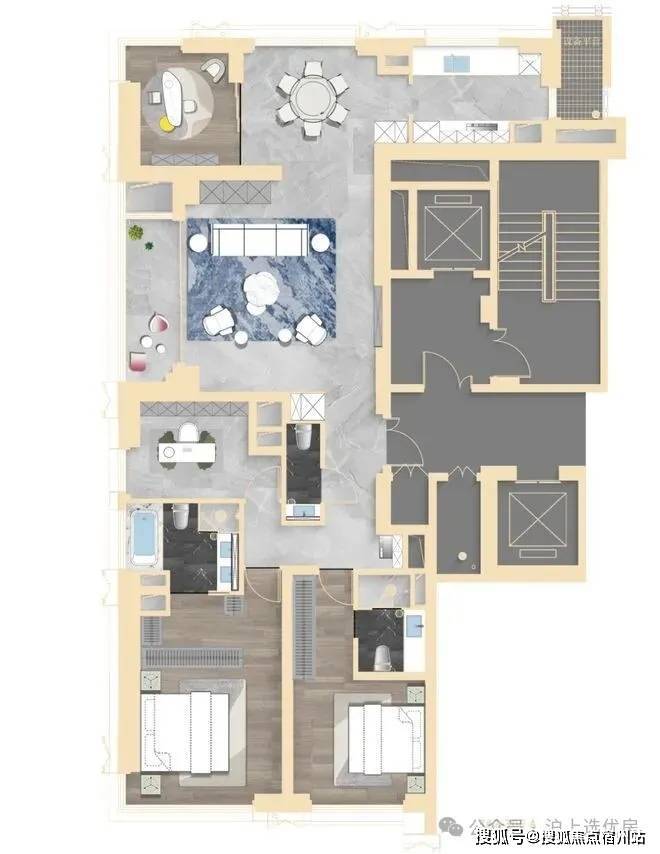 尤其主卧星级套房,配置独立衣帽间、书房,奢华主卫四分离,双台盆+淋浴区+大浴缸+智能马桶,私密性&奢适度无敌;