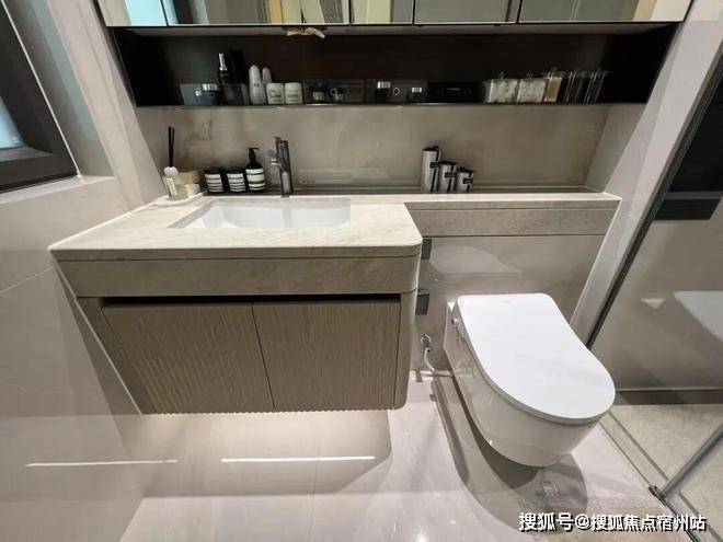 记忆点最深的还是卫生间的储藏功能,镜柜打开空间大不说,就连马桶上方那一点台面空间也没放过,全都利用了起来,可见细节设计上真的花了不少心思!