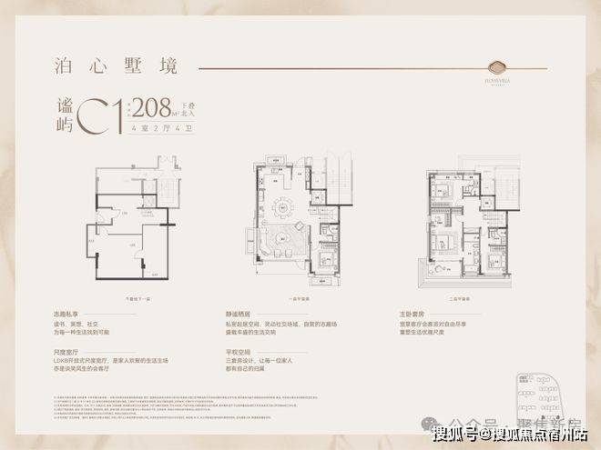 下叠户型,一楼南向大横厅约9.3米的南向面宽,配合约3.3米的层高,营造出开阔的空间感;