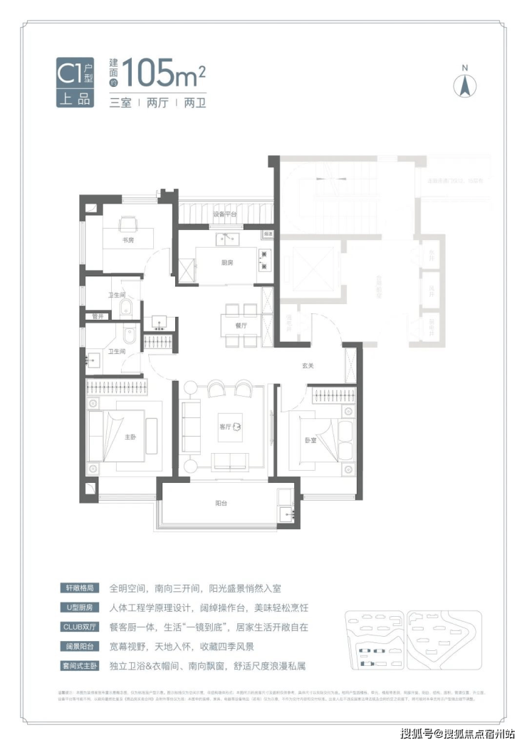 罕见宽厅设计:约95%的宽厅设计出现在120㎡以上户型中,而项目在约105㎡面积段就做了宽厅,非常难得,这个户型进入二手房市场将极具竞争力。