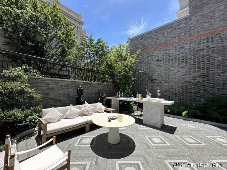 整个泳池天花板,呈现出海派拱形元素,落地玻璃窗外,是下沉式的景观空间: