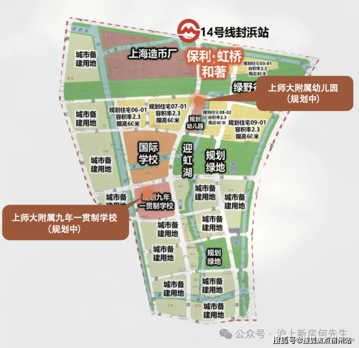 轨交:地块与地铁14号线终点站封浜站的直线距离不到500米,坐一站到乐秀路,未来可以换乘嘉闵线(在建),连接大虹桥、七宝、春申等板块。