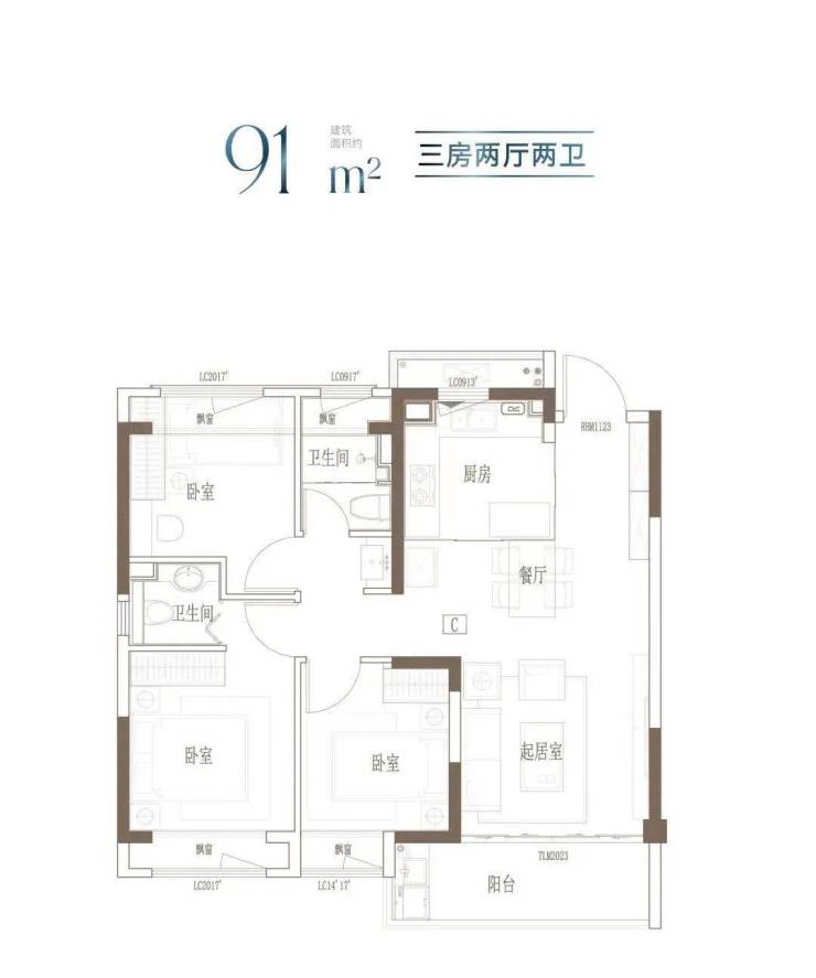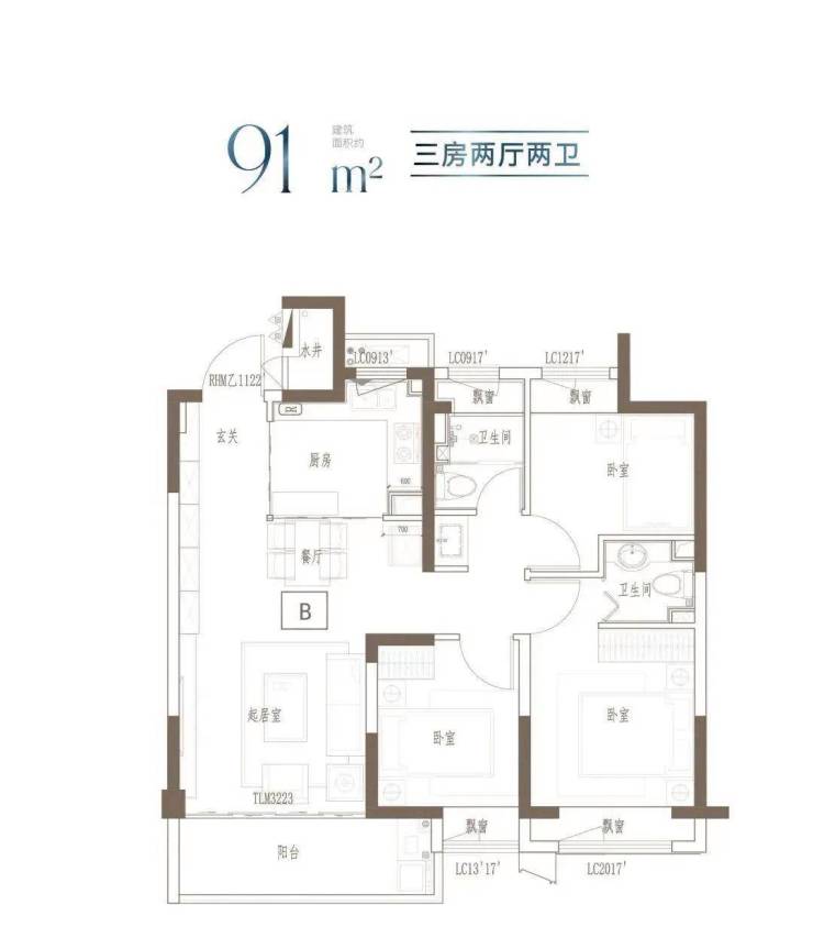 建面约91m²的这个户型,3开间朝南,全屋阳光充足;L型厨房转角移门设计,最大化空间视野;四飘窗设计,通透空间享受;动静分区,亲密有度;套房式主卧,容纳私谧生活点滴。