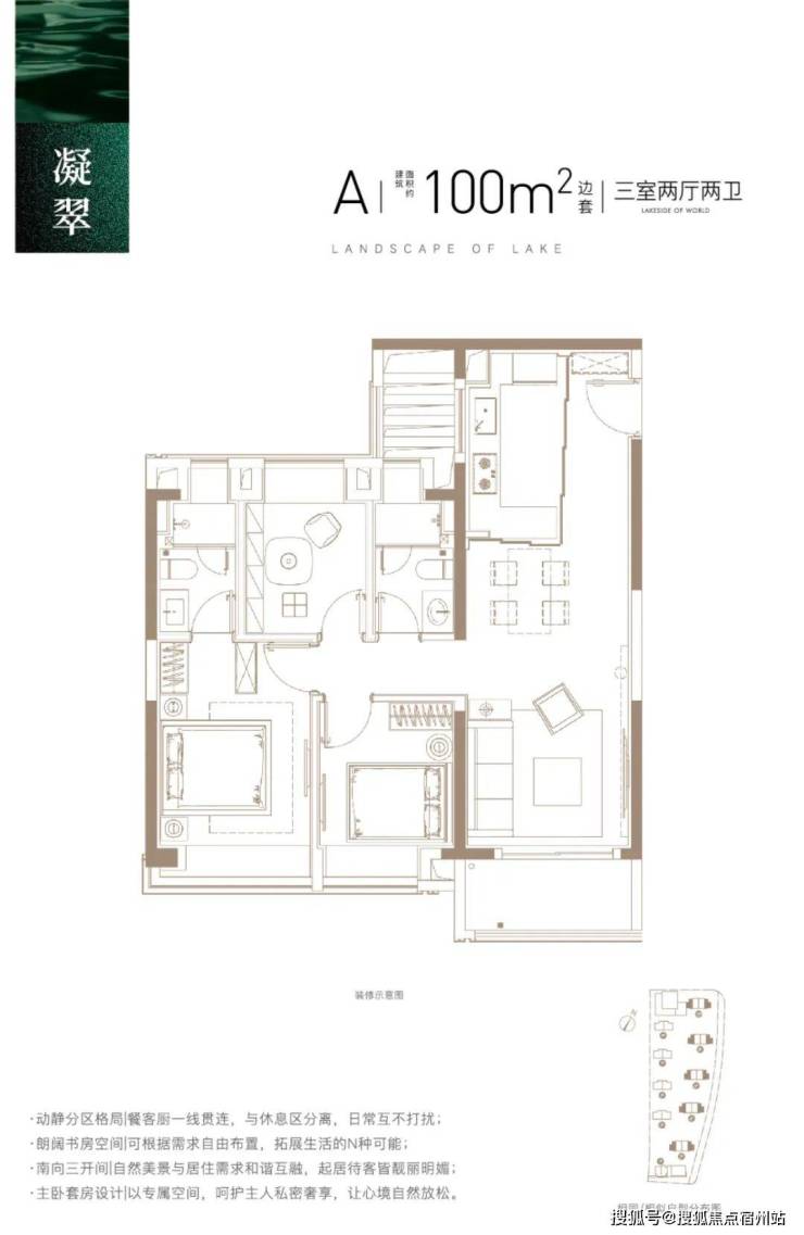 建面约100㎡3房2厅2卫, 做到了三开间朝南+主卧套房设计+动静分离+全卧室带飘窗,功能性和尺度感完美结合的3房户型。