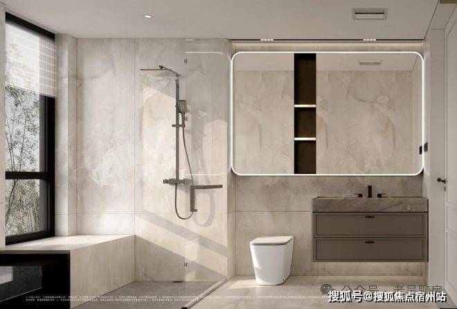 配备美妆龙头,大容量镜柜可收纳洗漱用品,利用墙面空间设置壁龛,便于存放毛巾、衣物便于取用。